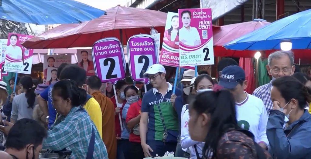 บรรยากาศการลงพื้นที่หาเสียงของผู้สมัคร นายก อบจ.นครราชสีมา นางยลดา หวังศุภกิจโกศล ภรรยาของ นายวีระศักดิ์ หวังศุภกิจโกศล รัฐมนตรีช่วยกระทรวงพาณิชย์ เดินพบปะพ่อค้าแม่ค้าตลาดสดประปา เพื่อแนะนำตัว บรรดาพ่อค้าแม่ค้าในตลาด สะท้อนปัญหาอยากให้ผู้นำองค์กรปกครองท้องถิ่น ช่วยผลักดันเรื่องราคาพืชผัก ผลผลิตการเกษตรให้สูงขึ้น สำหรับภาพรวม โคราชมีผู้สมัคร นายก อบจ. 5 คน และผู้สมัครสมาชิก อบจ. 48 เขตเลือกตั้ง จำนวน 173 คน มีผู้มีสิทธิ์ลงคะแนนกว่า 2 ล้านคน