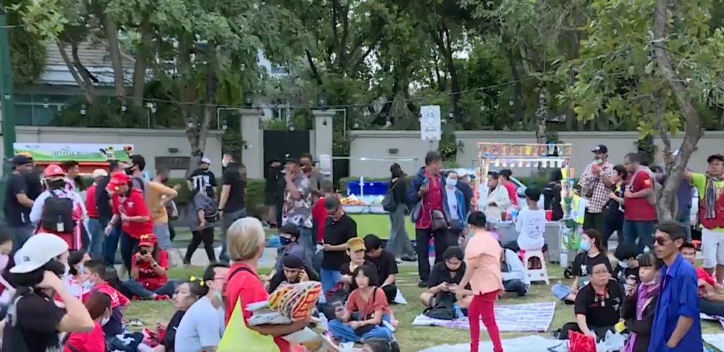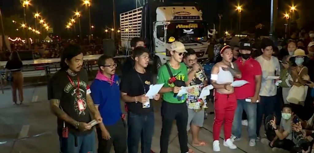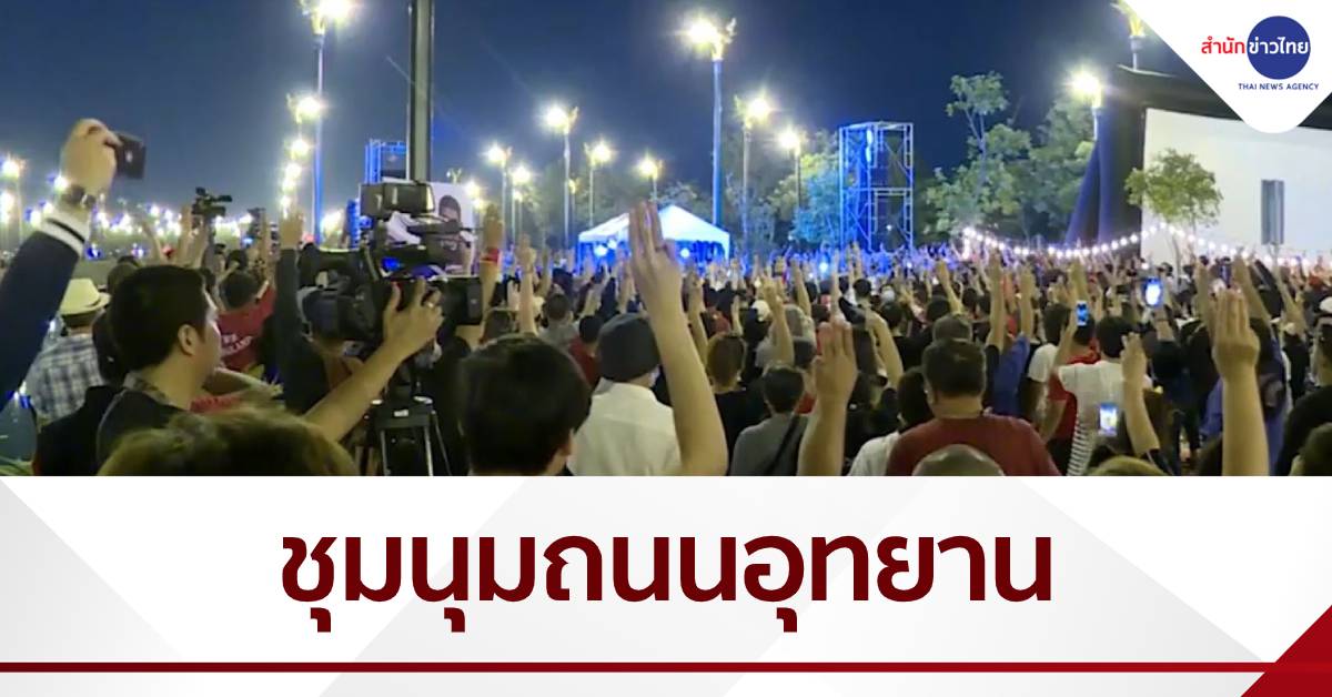 สำหรับเวทีปราศรัย ห่างจากแยกอุทยานมาประมาณ 500 เมตร โดยให้มวลชนหางแถวปัดไปทางถนนพุทธมณฑล และตลอดทางของถนนอุทยานจะมีกิจกรรมของงานวัดริมสองฝั่งของถนน และให้พื้นที่ช่องกลางเป็นพื้นที่ของมวลชน ซึ่งจะมีการสลับกันขึ้นปราศรัย โดยเมื่อช่วงเวลา 18.00 น.ที่ผ่านมาแกนนำ กลุ่มราษฎร อาทิ เพนกวิน พริษฐ์ ชิวารักษ์, ลูกเกด ชลธิชา แจ้งเร็ว เดินทางมาถึงเวทีการชุมนุม