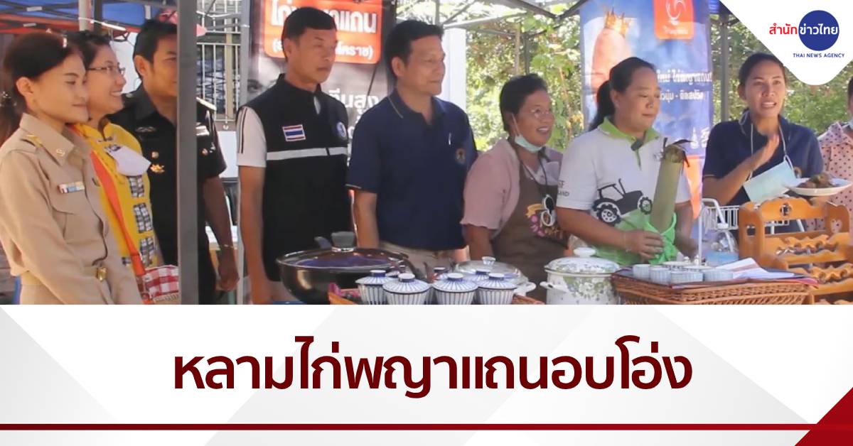 เป็นเกษตรกรตัวอย่าง Young Smart Farmer ยโสธร นางสาวกฤติกา วิชาธร หรือคุณฝน อยู่ที่บ้านดอนมะยาง ตำบลตาดทอง อำเภอเมืองยโสธร ได้ใช้พื้นที่หลังบ้านทำเป็นโรงเรือนเลี้ยงไก่พญาแถนเอาไว้ และเปิดเป็นศูนย์เรียนรู้การเพิ่มประสิทธิภาพการผลิตสินค้าเกษตร ซึ่งไก่พญาแถน เป็นไก่สายพันธุ์โคราช มีลักษณะคล้ายกับไก่บ้านทั่วไป หรือไก่พันธุ์พื้นเมือง เลี้ยงง่ายโตไว ใช้ระยะเวลาเลี้ยงเพียง 75 วัน ก็สามารถส่งขายได้ราคา กก.ละ 80 บาท ส่วนอาหารที่นำมาเลี้ยงไก่นั้น หลักๆ ก็เป็นผลผลิตทางการเกษตรตามวิถีอีสานทั้ง ถั่วเหลือง ปลายข้าว รำข้าว เปลือกกล้วย และเปลือกฟักทอง เพื่อลดต้นทุน และใช้น้ำหมักสมุนไพร ฟ้าทะลายโจร ขมิ้นชัน เพื่อเสริมสร้างสุขภาพสัตว์และช่วยการเจริญเติบโต และได้เนื้อไก่มีความนุ่ม ไม่ยุ่ยไม่แห้ง มีรสชาติหวาน และมีงานวิจัยว่ามีโปรตีนสูงไขมันต่ำ อีกด้วย ซึ่งนอกจากจะขายไก่เป็นตัวแล้ว ที่นี่ยังนำไก่แปรรูปเป็นอาหารหลากหลายเมนูเพื่อส่งจำหน่ายให้กับลูกค้าที่สั่งจองทางออนไลน์ ทั้งไก่พญาแถนย่างและไก่อบโอ่ง โดยเฉพาะเมนูหลามไก่พญาแถนที่นำไก่มาสับเป็นชิ้นๆ แล้วนำไปคลุกเคล้ากับเครื่องเทศสมุนไพรก่อนนำไปคั่วในกระทะพอขลุกขลิก จากนั้นก็ตักใส่ในกระบอกไม้ไผ่ ปิดกระบอกไม้ไผ่ด้วยใบตะไคร้ แล้วนำลงไปอบในโอ่งมังกร ที่มีเตาถ่านร้อนปานกลางอยู่ข้างในใช้ระยะเวลาอบประมาณ 30 นาที ก็จะได้หลามไก่พญาแถนอบโอ่ง ที่มีกลิ่นหอมชวนรับประทานนำมาเทใส่จานทานกับข้าวเหนียวร้อนๆ พร้อมด้วยไก่อบโอ่งหอมๆ และส้มตำปลาร้ารสนัว ราคาตัวละ 80-150 บาท ตามขนาด ขายได้วันละราว 20 ตัว สร้างรายได้ให้คุณฝนเป็นอย่างดี