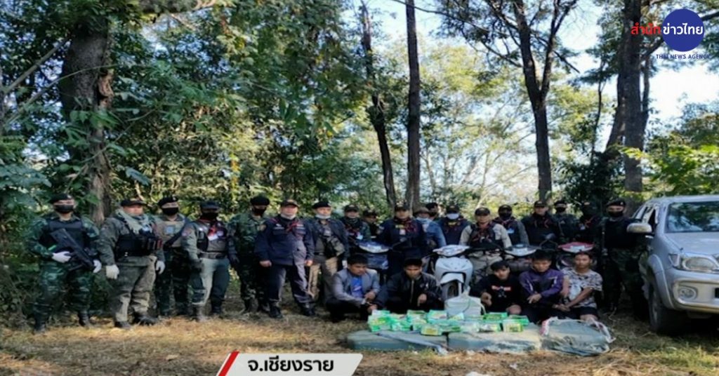 เจ้าหน้าที่ทหารกองกำลังผาเมือง พร้อมตำรวจ และฝ่ายปกครอง อ.แม่ฟ้าหลวง จ.เชียงราย จับกุมผู้ต้องหาลักลอบขนยาเสพติด รวม 8 คน พร้อมของกลางยาไอซ์ 160 กิโลกรัม ขณะลำเลียงจากชายแดนเข้ามาในพื้นที่หมู่ 3 ต.เทอดไทย อ.แม่ฟ้าหลวง โดยของกลางซุกซ่อนอยู่ในถุงชา 160 ถุง บรรจุไว้ในกระเป๋าเป้ 7 ใบ เบื้องต้นเจ้าหน้าที่ได้นำตัวผู้ต้องหาทั้งหมดพร้อมของกลางส่งพนักงานสอบสวน เพื่อขยายผลจับกุมผู้ร่วมเครือข่ายต่อไป. – สำนักข่าวไทย