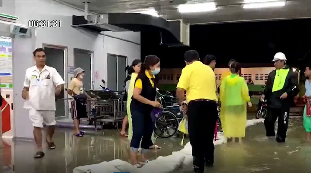 โดยนายแพทย์ทรงเกียรติ เล็กตระกูล ผอ.รพ.มหาราชนครศรีธรรมราช ได้ออกมาดูแลการทำงานของเจ้าหน้าที่ เนื่องจากเป็นห่วงผู้ป่วยที่จะเข้าทำการรักษา และหวั่นว่าระดับน้ำจะเพิ่มขึ้นจนทำให้เกิดความไม่สะดวกกับการให้บริการผู้ป่วย ขณะที่เจ้าหน้าที่ต้องทำงานกันอย่างหนัก เพราะเกรงว่าระดับน้ำจะไหลเข้าในห้องฉุกเฉินที่ผู้ป่วยเข้ามารับการรักษา ต้องนำกระสอบทรายมากั้นไว้หน้าห้องฉุกเฉิน
