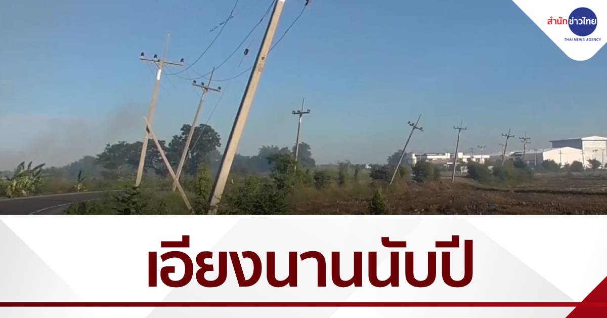 อ่างทอง 3 ธ.ค.-ประติมากรรมริมถนนเสาไฟฟ้านับสิบต้น เอียงกะเท่เร่นานนับปี ไร้การแก้ไข ชาวบ้านหวั่นล้ม วอนหน่วยงานที่เกี่ยงข้องแก้ไขด่วน จ.อ่างทอง