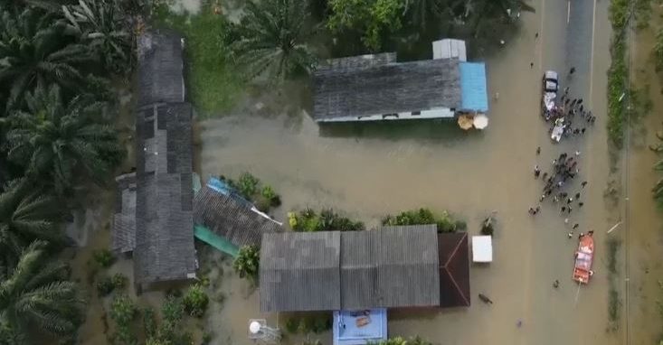นี่คือภาพมุมสูงเผยให้เห็นถึงมวลน้ำจำนวนมหาศาลจาก อ.ทุ่งสง จ.นครศรีธรรมราช ไหลหลากเข้าท่วม อ.เมืองตรัง ริมฝั่งแม่น้ำตรัง ซึ่งเป็นพื้นที่รับน้ำตอนล่างของจังหวัด และมีน้ำท่วมซ้ำซากเป็นประจำทุกปี โดยเฉพาะ ต.หนองตรุด ต.บางรัก ต.นาโต๊ะหมิง และ ต.ควนปริง รวมทั้งถนนสายตรัง-สิเกา ช่วงใกล้กับโรงเรียนวิทยาศาสตร์จุฬาภรณ์ราชวิทยาลัยตรัง ที่มีสภาพเป็นแอ่งกระทะ ระบบระบายน้ำไม่มีประสิทธิภาพ ผลกระทบจากน้ำท่วมยังทำให้สะพานแบริ่งชั่วคราวที่ใช้สัญจรระหว่าง ต.หนองตรุด อ.เมืองตรัง ไปยัง ต.เขาวิเศษ อ.วังวิเศษ ก็ต้องถูกปิด และเลี่ยงไปใช้เส้นทางอื่นแทน ทั้งนี้ คาดว่าประชาชนในพื้นที่ต้องเผชิญกับปัญหาน้ำท่วมขังไปอย่างน้อย 1 สัปดาห์ ก่อนน้ำจะไหลผ่านไปยังอำเภอกันตัง เพื่อระบายลงสู่ทะเลอันดามันต่อไป.-สำนักข่าวไทย