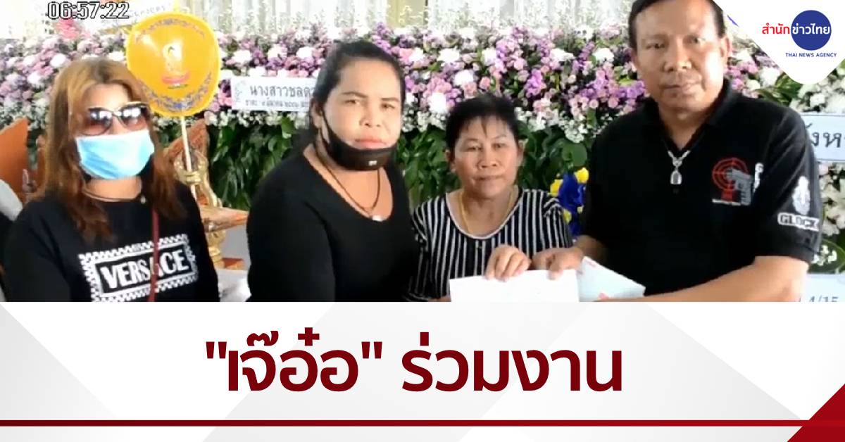 เจ๊อ๋อ มอบเงิน 30,000 บาท เพื่อช่วยเหลือครอบครัวน้องจูน พร้อมกับมอบหนังสือให้ครอบครัวน้องจูนไว้อ่านคลายเครียด เจ๊อ๋อ เล่าวว่า เมื่อเย็นวานนี้ (6 ธ.ค.) หลังจากเดินทางไปมอบเงินช่วยเหลือโรงเรียนที่ถูกไฟไหม้ 50,000 บาท ให้สำนักงานเขตพื้นประถมศึกษาอุดรธานี เขต 2 ที่หอประชุมมหาวิทยาลัยราชภัฏอุดรธานี และรับมอบใบประกาศนียบัตรขอบคุณแล้ว จู่ๆ รู้สึกเหมือนมีอะไรมาสัมผัส ทำให้ตนน้ำตาไหล และเห็นภาพเด็กผู้หญิง 2 คน ยืนร้องไห้อยู่ เด็กที่มีบาดแผลที่ลำคอ พูดว่า “หนูอยากเห็นแม่มานานแล้ว หนูมาขอส่วนบุญกับแม่หน่อย” ตนจึงบอกเด็กว่า เดี๋ยวแม่จะทำบุญไปให้ ตนจึงเดินทางมามอบเงินทำบุญกับครอบครัวน้องจูน