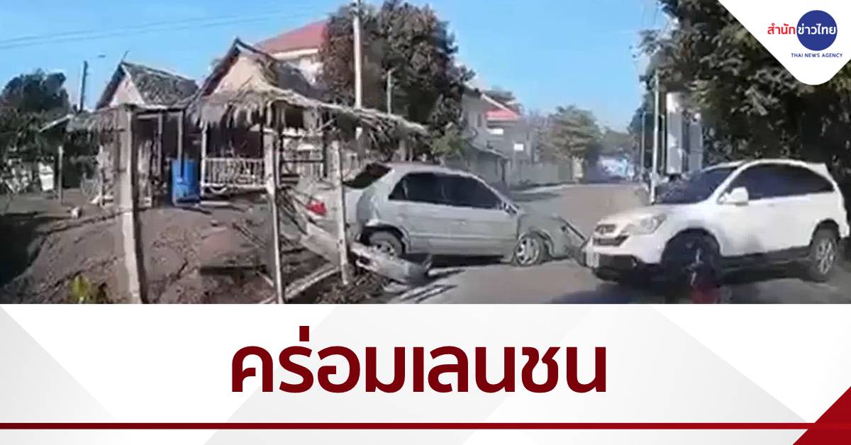 นนทบุรี 9 ธ.ค.-กล้องหน้ารถบันทึกภาพเหตุการณ์ซีอาร์วีวิ่งคร่อมเลนชนรถเก๋งวิ่งสวนทางกระเด็นไปถูกประตูรั้วชาวบ้านเสียหาย