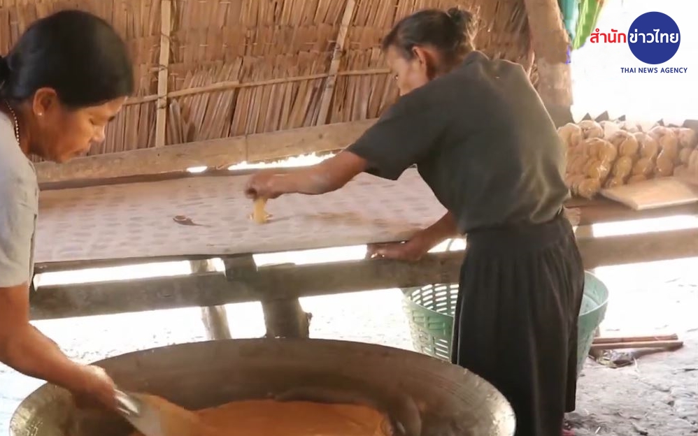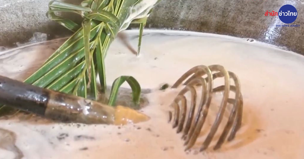 จากนั้นก็นำมาต้มกับเตาฟืน เก็บรวบรวมน้ำหวานไว้ 3 วัน ก่อนเข้าสู่กระบวนการใส่กระทะเคี่ยว เพื่อทำน้ำตาลปี๊บไปเรื่อยๆ ประมาณ 30 นาที หากต้องการให้ได้น้ำตาลที่มีสีแดงสวยน่ารับประทาน ก็จะต้องนำใบมะพร้าวที่เป็นใบสดๆ มาต้มลงในกระทะพร้อมกับน้ำหวาน เมื่อน้ำตาลเหนียวข้น จะคนและตีน้ำตาลให้มีความเหนียวข้นจับตัวกันแน่น ใช้เวลาอีก 15-20 นาที ก่อนจะตักลงมาวางบนผ้าบาง และจัดใส่ถุงเพื่อจำหน่าย จะไม่ใส่สารกันบูด ซึ่งจะมีแม่ค้ามารับซื้อถึงที่บ้าน โดยน้ำหวานที่เคี่ยว 1 กระทะ จะได้น้ำตาลประมาณ 15-17 กิโลกรัม จำหน่ายกิโลกรัมละ 40 บาท ใครที่สนใจอยากเรียนรู้ หรือต้องการน้ำตาลมะพร้าวสูตรโบราณแท้ๆ ไปทำขนมและอาหาร ติดต่อได้ที่ 098-7683760. – สำนักข่าวไทย