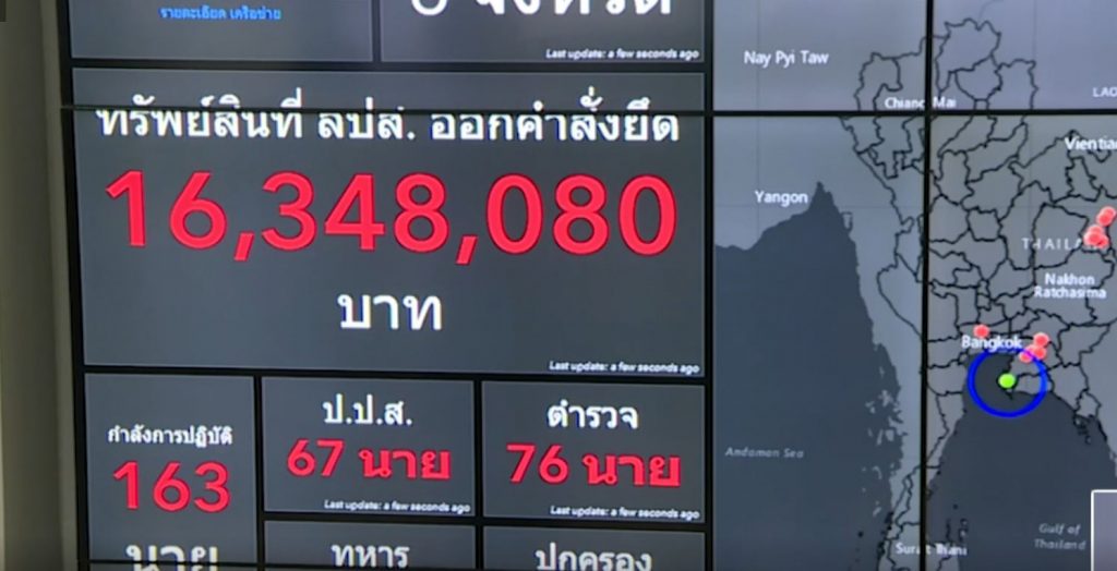 ขณะที่พื้นที่กรุงเทพฯ นายสมศักดิ์ เทพสุทิน รัฐมนตรีว่าการกระทรวงยุติธรรม นำทีมแถลงปฏิบัติการยุทธการพิทักษ์ไทยยึดทรัพย์ ตัดวงจรยาเสพติด ในภาพรวมว่า มีการปูพรมเช้านี้ 15 จุด ใน 6 จังหวัด 7 เครือข่าย และมีการวีดิโอคอนเฟอร์เรนซ์ปฏิบัติการในทุกจุด โดยจุดใหญ่สุดอยู่ที่จังหวัดขอนแก่น ซึ่งการขยายผลยึดทรัพย์ในวันนี้ ได้มาเพิ่มอีกกว่า 16 ล้านบาท จากที่ครั้งก่อนยึดไปแล้ว 16,348,080 ล้านบาท รวมขยายผลยึดทรัพย์ในปฏิบัติการนี้ 30 กว่าล้านบาท