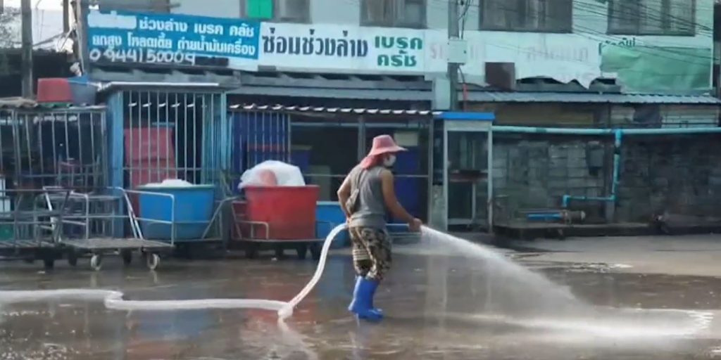 จากกรณีที่มีการพบผู้ป่วยโควิด-19 ในจังหวัดสมุทรสาคร 1 คน เป็นหญิงชาวไทยวัย 67 ปี อาชีพค้าขาย อยู่ในตลาดกลางกุ้งจังหวัดสมุทรสาครนั้น เช้าวันนี้บรรยากาศที่บริเวณหน้าตลาดกลางกุ้ง เป็นไปอย่างเงียบเหงา ไม่มีคนเข้าไปทำงาน และได้ขึ้นป้ายประกาศติดไว้ว่า วันนี้ตลาดปิด 1 วัน เพื่อ Big Cleaning โดยคำสั่งผู้ว่าราชการจังหวัด ขณะเดียวกันแรงงานต่างด้าวชาวเมียนมาที่อยู่ในตลาดกุ้ง ช่วยกันกวาดล้างทำความสะอาดพื้นถนน ส่วนแรงงานที่ไม่ได้ทำงานก็พักอาศัยอยู่แต่ในอาคารด้านหลังตลาดกุ้ง