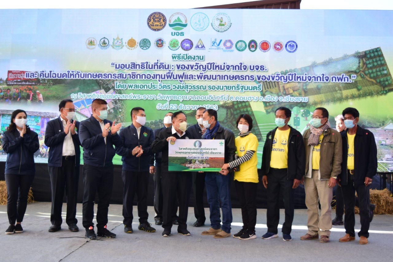 พลเอก ประวิตร วงษ์สุวรรณ รองนายกรัฐมนตรี เป็นประธานในพิธีมอบสิทธิในที่ดิน ของขวัญปีใหม่จากใจ บจธ. โดยพิธีมอบสิทธิในที่ดินตามโครงการบริหารจัดการที่ดินอย่างยั่งยืน ของ สถาบันบริหารจัดการธนาคารที่ดิน (องค์การมหาชน) และคืนโฉนดให้กับสมาชิกเกษตรกรสมาชิกกองทุนฟื้นฟูและพัฒนาเกษตรกร ของขวัญปีใหม่จากใจ กฟก. ณ วิสาหกิจชุมชนศาสตร์พระราชา วัดพุทธอุทยานดอยอินทรีย์ ตำบลดอยฮาง อำเภอเมือง จังหวัดเชียงราย โดยมีเกษตรกรเข้าร่วมโครงการทั้งที่ได้รับสิทธิในที่ดินแล้ว และที่อยู่ระหว่างขอความช่วยเหลือกว่า 1,000 คน