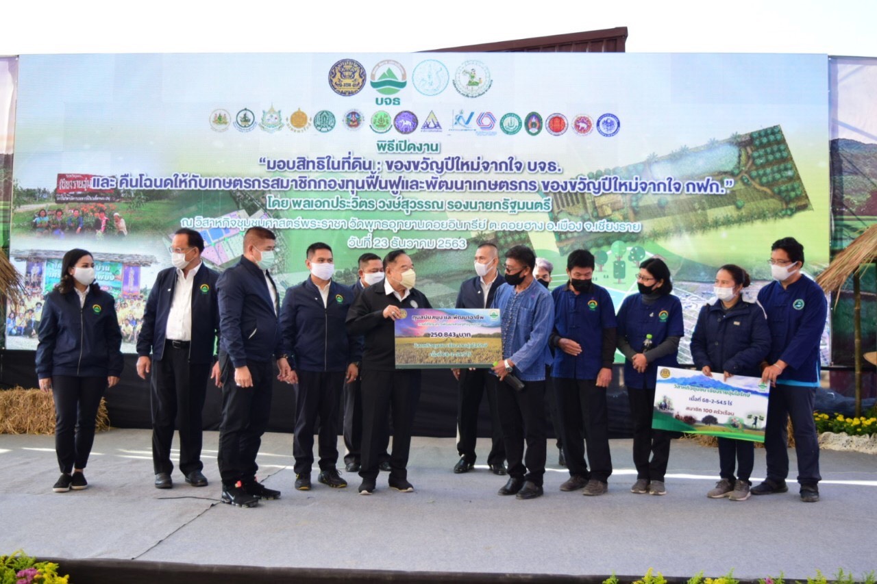 โดยในปีนี้ได้เตรียมของขวัญปีใหม่ 2564 บจธ. มอบสิทธิในที่ดิน ของขวัญปีใหม่จากใจ บจธ. และคืนโฉนดให้กับเกษตรกร สมาชิกกองทุนฟื้นฟูและพัฒนาเกษตรกร ของขวัญปีใหม่จากใจ กฟก. เพื่อสนองนโยบายรัฐบาลในการแก้ไขปัญหาเกษตรกร ผู้ยากจน และพี่น้องที่ว่างงาน มอบสิทธิในที่ดิน เป็นขวัญให้แก่ทุกคน ได้มีอาชีพ สามารถพึ่งพาตนเองได้อย่างมั่นคงและยั่งยืน