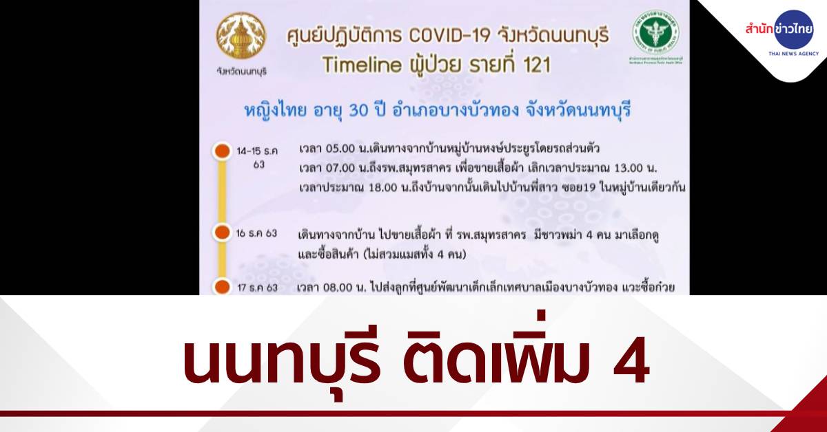 ศูนย์ปฏิบัติการโควิด-19 นนทบุรี รายงานพบผู้ติดเชื้อรายใหม่ 4 คน ในจำนวนนี้ 3 คน เชื่อมโยงเดินทางไปที่สมุทรสาคร โดยไทม์ไลน์ผู้ป่วยใหม่ คนแรกหญิงอายุ 30 ปี ชาวอำเภอบางบัวทอง ช่วง 14-15 ธ.ค. มีประวัติเดินทางไปขายเสื้อผ้าที่สมุทรสาคร รายที่สอง ชาย 39 ปี อำเภอบางใหญ่ พบเคยเดินทางไปร้านข้าวต้มที่มหาชัย ไทม์ไลน์ยังพบเดินทางไปหลายที่ทั้งตลาดย่านบางใหญ่ ไปทำงานที่สมุทรปราการ รายที่สาม ชาย 24 ปี อำเภอเมืองนนทบุรี มีประวัติไปตลาดทะเลไทย สมุทรสาคร เมื่อ 12 ธ.ค. ซื้ออาหารทะเลเตรียมเปิดร้านขายอาหารทะเลปิ้งย่าง