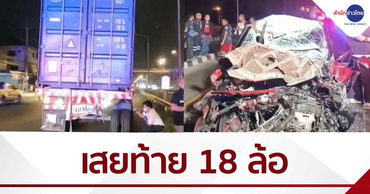 พัทยา 24 ธ.ค.-พยาบาลสาว รพ.บางละมุง ขับรถเก๋งชนท้ายรถพ่วง 18 ล้อ รถพังยับ บาดเจ็บสาหัส