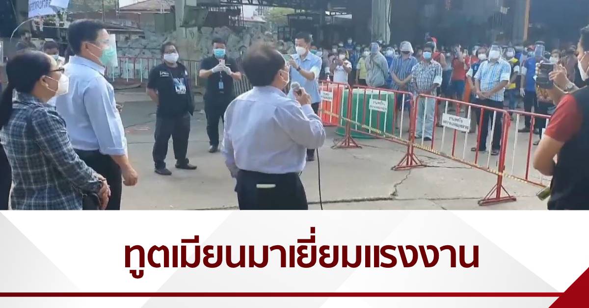 สมุทรสาคร 25 ธ.ค.-จ.สมุทรสาคร จุดเริ่มต้นของการพบเชื้อโควิด-19 เอกอัครราชทูตเมียนมาประจำประเทศไทย ได้ลงพื้นที่มอบของและเยี่ยมเพื่อเป็นขวัญกำลังใจแรงงานเมียนมา ขณะที่ผู้ว่าฯ สมุทรสาคร ปรับแผนตรวจหาเชื้อ เพื่อให้เกิดความรวดเร็ว