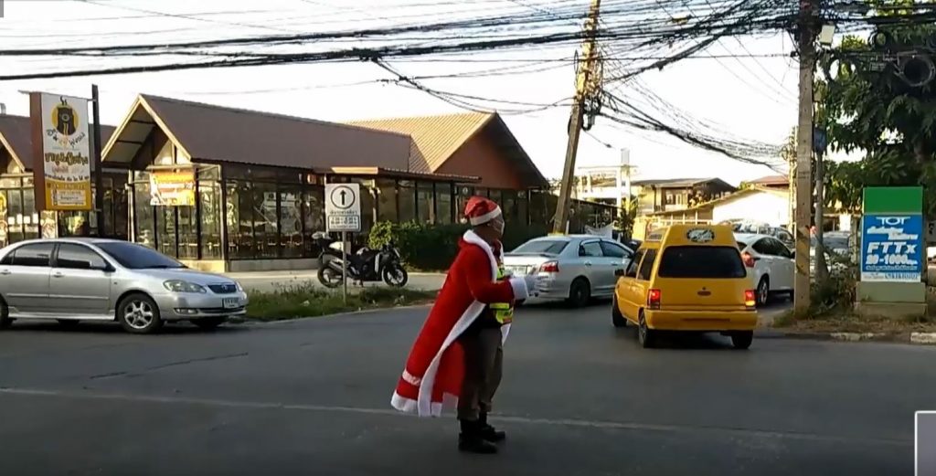ปิดท้ายที่จังหวัดพิษณุโลก คุณพี่ตำรวจมาสร้างสีสันรับวันคริสต์มาส ด้วยการแต่งชุดซานตาคลอส มาคอยอำนวยความสะดวกการจราจรบริเวณทางแยกเข้าโรงเรียนโรจนวิทย์มาลาเบี่ยง คุณพี่ท่านนี้ คือ ดาบตำรวจประเสริฐ รุ่งเรือง ผบ.หมู่ ป.ช่วยงานจราจร สภ.เมืองพิษณุโลก ซึ่งมาปฏิบัติหน้าที่และแต่งชุดซานต้าแบบนี้มากว่า 10 ปีแล้ว สร้างรอยยิ้มให้กับเด็กนักเรียน ผู้ปกครองและประชาชนผู้สัญจรผ่านไปมา
