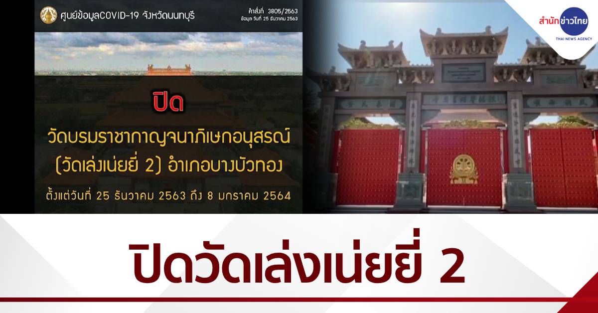 นนทบุรี 26 ธ.ค.-ผู้ว่าฯ นนทบุรี สั่งปิดวัดเล่งเน่ยยี่ 2 ตั้งแต่วันที่ 25 ธ.ค.-8 ม.ค.64 หลังพบหญิงชาวเมียนมา 2 คน ทำงานอยู่ในโรงครัวของวัด ติดโควิด-19 กักตัว 14 วัน พระ เณร และผู้ที่ทำงานในวัด 113 คน