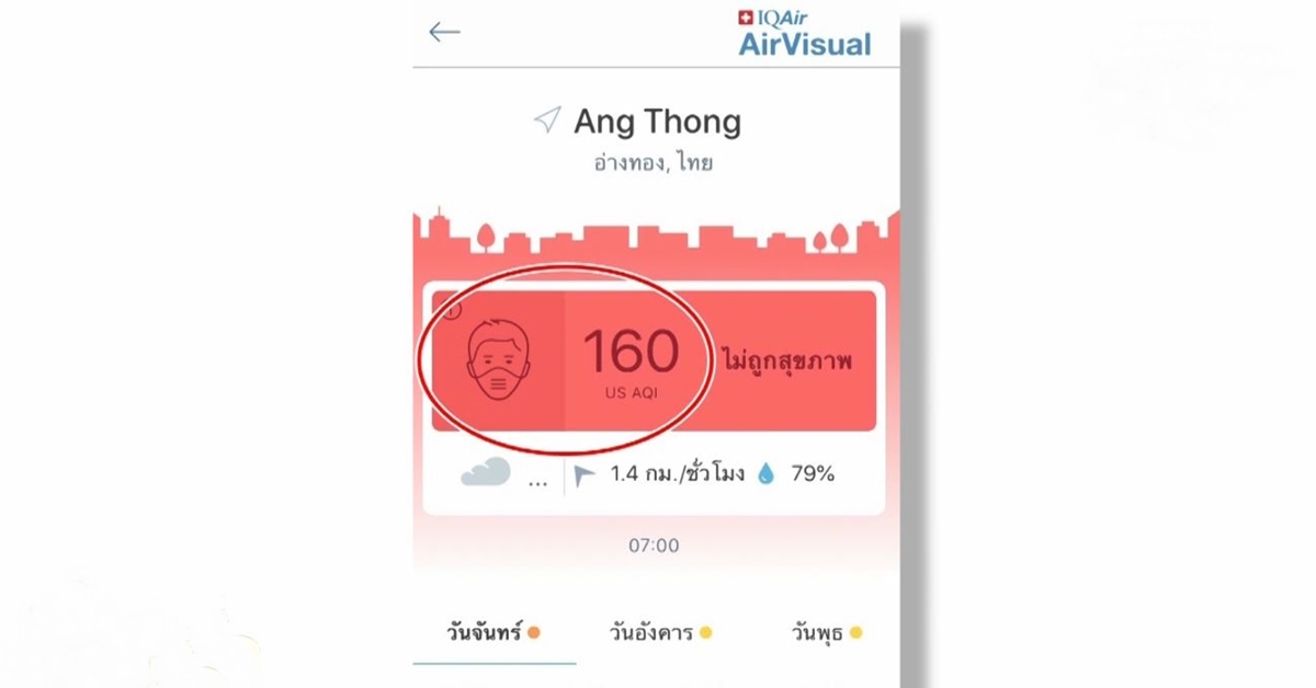 ตั้งแต่ช่วงเช้าวันนี้ (28 ธ.ค.) ในพื้นที่ จ.อ่างทอง ค่าฝุ่นละอองขนาดเล็ก หรือ PM 2.5 เพิ่มปริมาณสูงขึ้นอย่างต่อเนื่องอีกระลอก โดยข้อมูลจากแอปพลิเคชัน Air Visual ซึ่งเป็นแอปพลิเคชันตรวจวัดปริมาณฝุ่นละออง PM 2.5 สามารถตรวจวัดค่าฝุ่นในพื้นที่ จ.อ่างทอง มีปริมาณเกินมาตรฐานที่ 50 ไมโครกรัม พุ่งขึ้นไปอยู่ที่ 73.2 ไมโครกรัม หรือ 160 AQI อยู่ในโซนสีแดง ซึ่งส่งผลกระทบต่อประชาชนทั่วไป โดยเฉพาะเด็ก ผู้สูงอายุ และผู้ป่วยโรคทางเดินหายใจ จากการตรวจสอบพื้นที่โดยเฉพาะบริเวณที่เป็นชุมชน เช่น ในพื้นที่ตัวเมืองอ่างทอง มีฝุ่นละอองขนาดเล็กปกคลุมอยู่ทั่วบริเวณ บางพื้นที่มีฝุ่นปกคลุมจนทำให้ดูคล้ายหมอกลงหนาจัดตลอดทั้งวัน