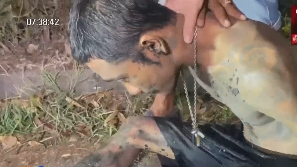 จากนั้นตำรวจสายตรวจได้ขอกำลังสนับสนุนจากฝ่ายปกครอง นำโดยนายปฏิญญา พานิชอัตรา นายอำเภอแหลมสิงห์ กำนัน ผู้ใหญ่บ้าน และกู้ภ้ยสว่างกตัญญูธรรมสถานจันทบุรี ร่วมกันค้นหาอย่างระมัดระวัง ใช้เวลาประมาณ 2 ชั่วโมง ผู้ก่อเหตุจึงได้เดินออกมาจากป่าข้างบ้านพักในสภาพเนื้อตัวมอมแมม ยอมจำนนให้เจ้าหน้าที่ควบคุมตัวแต่โดยดี ทราบชื่อ นายนันธเดช อายุ 35 ปี มีประวัติเคยถูกจับได้รับการบำบัดยาเสพติดมาแล้ว 4 ครั้ง โดยครั้งนี้เพิ่งกลับออกมา อาศัยอยู่กับบ้านพักของแม่ ซึ่งเปิดเป็นร้านขายอาหารตามสั่งอยู่ติดกับโรงพยาบาล เวลาว่างจะออกไปหาปูหาปลามาจำหน่ายให้กับบุคคลในพื้นที่ใกล้เคียง รวมถึงผู้ที่ถูกทำร้ายด้วย