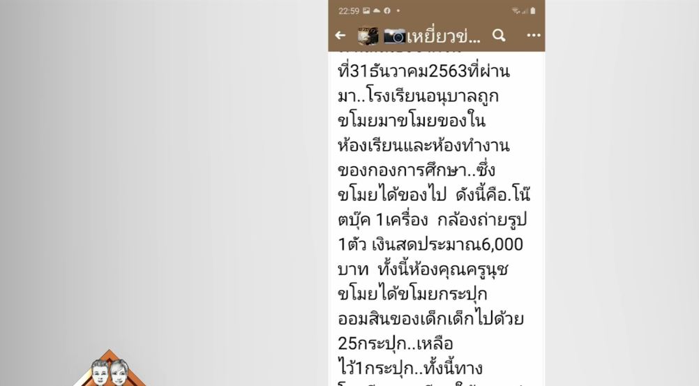 ผู้ใช้เฟซบุ๊กคนนี้ยังได้โพสต์ข้อความว่า “ใครรู้เบาะแสแจ้งครูหน่อยนะคะ โรงเรียนอนุบาลเทศบาลตำบลนางั่ว คิดว่าน่าจะเป็นคนในพื้นที่ ต.นางั่ว เรียนผู้ปกครองทุกท่าน..เนื่องจากวันที่ 31 ธันวาคม 2563 ที่ผ่านมา..โรงเรียนอนุบาลถูกขโมยมาขโมยของในห้องเรียน และห้องทำงานของกองการศึกษา..ซึ่งขโมยได้ของไป ดังนี้ คือ.โน้ตบุ๊ก 1 เครื่อง กล้องถ่ายรูป 1 ตัว เงินสดประมาณ 6,000 บาท ทั้งนี้ ห้องคุณครูนุช ขโมยได้ขโมยกระปุกออมสินของเด็กไปด้วย 25กระปุก..เหลือไว้ 1 กระปุก..ทั้งนี้ทางโรงเรียนขอเรียนให้ทราบว่าได้ดำเนินการแจ้งความแล้วเรียบร้อย.จึงเรียนมาเพื่อทราบ….ครูหน่อย