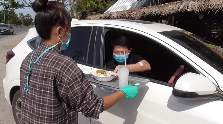 ให้จอดรถเหมือนมากินข้าวที่ร้าน โดยบีบแตรเรียกพนักงานรับออเดอร์เมนูอาหาร เก็บเงิน ทอนเงินที่กระจกคนขับเท่านั้น โดยมีระยะห่าง 1 เมตร และเมื่อสั่งเสร็จพนักงานจะนำออเดอร์มาประกอบอาหารก่อนนำไปส่งให้ที่รถ และลูกค้าสามารถรับประทานในรถได้โดยการติดเครื่องเปิดแอร์ได้ตามสบาย หากเรียกสั่งอาหารเพิ่มหรือเก็บเงินก็ใช้แตรเป็นการส่งสัญญาณ โดยหลังทานเสร็จมีพนักงานทางร้านนำถังขยะมารองรับเพื่อรวบรวมขยะและส่งกลับมาทิ้งเอง ซึ่งหากนำไปปรับใช้มาตรการที่ภาครัฐเยียวยา แค่นี้พ่อค้าแม่ค้าสามารถที่จะประกอบการได้ไม่เสี่ยงต่อการแพร่ระบาดของไวรัส แค่นี้ก็รอดไปครึ่งประเทศแล้ว