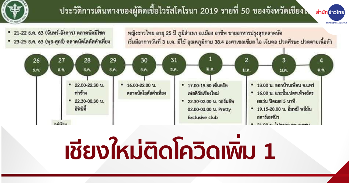 นายเจริญฤทธิ์ สงวนสัตย์ ผู้ว่าราชการจังหวัดเชียงใหม่ พร้อมด้วยนายแพทย์จตุชัย มณีรัตน์ สาธารณสุขจังหวัดเชียงใหม่ ร่วมแถลงยืนยันการพบผู้ป่วยติดเชื้อโควิด-19 รายใหม ซึ่งเป็นผู้ป่วยสะสมรายที่ 50 ของจังหวัด เป็นหญิงไทยวัย 25 ปี อาชีพขายอาหารปรุงสุกตลาดนัด แต่ที่สำคัญไทม์ไลน์ช่วงตั้งแต่วันที่ 28 ธ.ค.63-1 ม.ค.64 ไปสถานบันเทิงชื่อดังของเชียงใหม่ถึง 5 แห่ง ยังไม่รวมตลาดนัด และเดินทางข้ามจังหวัด ทั้งลำปางและแพร่ ขณะนี้กำลังเร่งสืบสวนโรคและติดตามกลุ่มเสี่ยงเข้ารับการตรวจ.-สำนักข่าวไทย