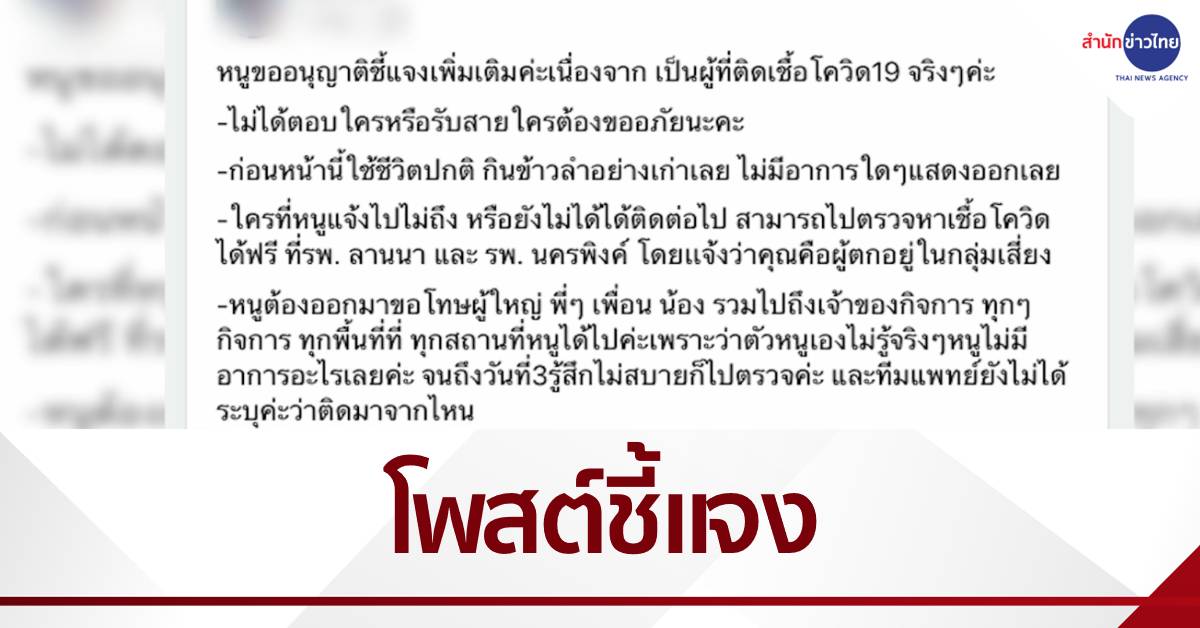 เฟซบุ๊กส่วนตัวของหญิงสาวชาวเชียงใหม่วัย 25 ปี รายหนึ่ง โพสต์ข้อความยอมรับว่า เป็นผู้ป่วยโควิด-19 รายล่าสุดของจังหวัดเชียงใหม่ โดยได้ขอโทษเจ้าของกิจการต่างๆ และผู้ที่ได้รับผลกระทบจากไทม์ไลน์ของตนเอง ยืนยันก่อนหน้านี้ไม่มีอาการบ่งบอกว่าป่วย จึงใช้ชีวิตตามปกติ พร้อมแจงข้อสงสัยที่ถูกตั้งคำถาม ยืนยันเป็นแม่ค้าขายอาหารตามตลาดนัดจริง ไม่ได้เป็นพริตตี้ แต่ชอบเที่ยว และระหว่างการขายอาหารตามตลาดนัด สวมหน้ากากอนามัยตลอดเวลา จนวันที่ 3 มกราคม จึงมีอาการป่วย ซึ่งหมอตั้งข้อสังเกตอาจได้รับเชื้อจากเงินหรือสัมผัสจุดที่มีเชื้อ ยืนยันให้ข้อมูโควิด-19 ที่เป็นจริงต่อเจ้าหน้าที่อย่างละเอียดแล้ว พร้อมลงท้าย หนูเป็นโควิด-19 ไม่ใช่โจรยิงกราด