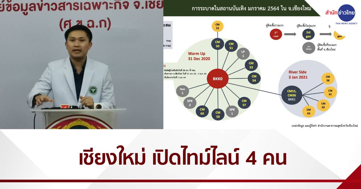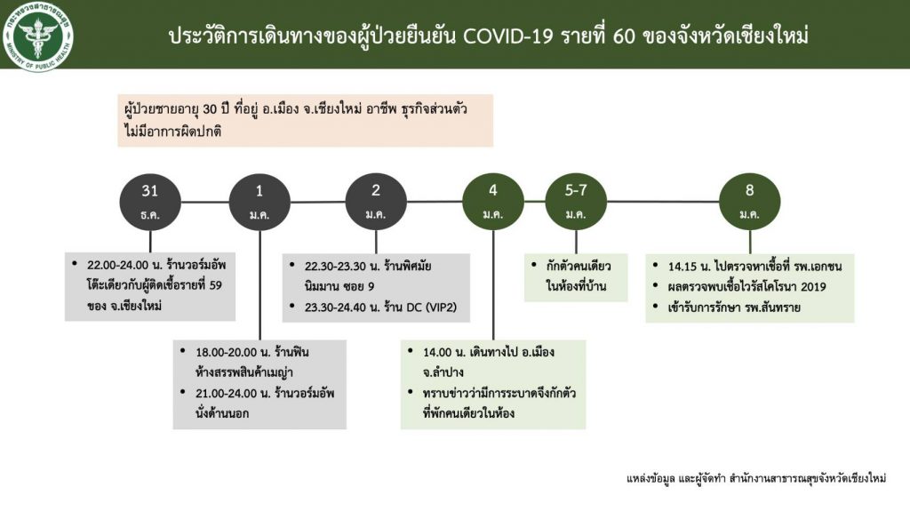 - ผู้ป่วยโควิด-19 รายที่ 60 (CM 60) ของจังหวัดเชียงใหม่ ชายไทย อายุ 30 ปี ที่อยู่ อ.เมือง จ.เชียงใหม่ อาชีพธุรกิจส่วนตัว ประวัติเดินทางไปยังร้านวอร์มอัพ ในคืนวันที่ 31 ธ.ค. 63 โดยนั่งโต๊ะเดียวกันกับผู้ป่วยโควิด-19 รายที่ 59 ของจังหวัดเชียงใหม่ ไม่มีอาการผิดปกติ ขณะนี้รับรักษาตัวห้องแยกความดันลบ โรงพยาบาลสันทราย