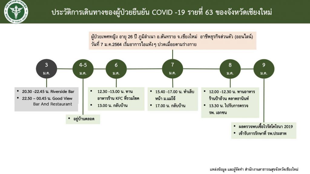 - ผู้ป่วยโควิด-19 รายที่ 63 (CM 63) ของจังหวัดเชียงใหม่ หญิงไทย อายุ 26 ปี ที่อยู่ อ.สันทราย จ.เชียงใหม่ อาชีพ ธุรกิจส่วนตัว มีประวัติไปยังร้านริเวอร์ไซด์ ในคืนวันที่ 3 ม.ค. 64 ซึ่งมีผู้ติดเชื้อเดินทางไปรับบริการ นั่งโต๊ะติดกัน