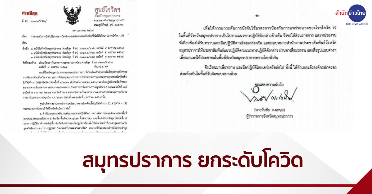 เมื่อวันที่ 10 ม.ค.64 นายวันชัย คงเกษม ผู้ว่าราชการจังหวัดสมุทรปราการ ลงนามคำสั่ง ด่วนที่สุด ที่ สป 0017.1/ว108 เรื่อง การยกระดับการบังคับใช้มาตรการป้องกันการแพร่ระบาดของโรคติดเชื้อไวรัสโคโรน่า 2019 หรือ โรคติดเชื้อไวรัสโคโรน่า 2019 หรือ โรคโควิด-19 (COVID-19) ความว่า ตามที่จังหวัดสมุทรปราการ มอบหมายส่วนราชการที่เกี่ยวข้องดําเนินการจัดตั้งจุดตรวจคัดกรองการเดินทางข้ามจังหวัด ตามมาตรการที่ประชุมคณะกรรมการบริหารสถานการณ์การแพร่ระบาดของโรคติดเชื้อไวรัสโคโรน่า 2019 (โควิด-19) ครั้งที่ 1/2564 เมื่อวันที่ 4 มกราคม 2564 และถือปฏิบัติตามข้อกําหนด ออกตามความในมาตรา 9 แห่งพระราชกําหนดการบริหารราชการในสถานการณ์ฉุกเฉิน พ.ศ. 2548 (ฉบับที่ 16) ลงวันที่ 3 มกราคม 2564 และข้อกําหนด ออกตามความในมาตรา 9 แห่งพระราชกําหนดการบริหารราชการในสถานการณ์ฉุกเฉิน พ.ศ. 2548 (ฉบับที่ 17) ลงวันที่ 6 มกราคม 2564 นั้น