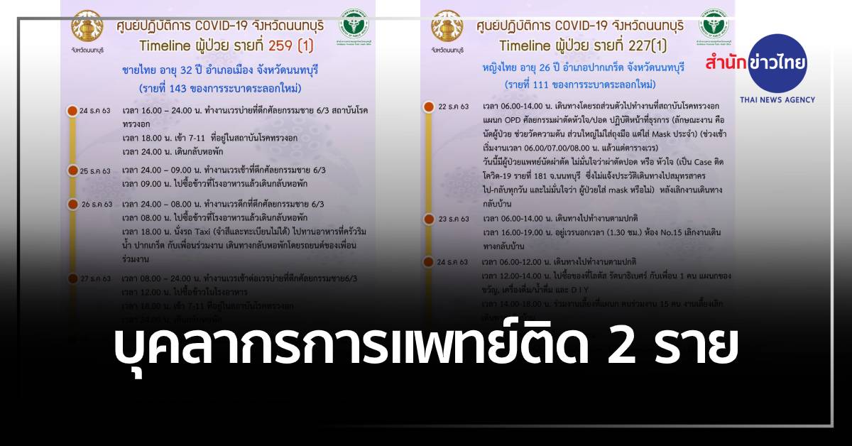 ศูนย์ปฏิบัติการโควิด-19 จังหวัดนนทบุรี แจ้งว่า มีบุคลากรทางการแพทย์ติดเชื้อโควิด-19 จำนวน 2 ราย รายแรกเป็นหญิงไทย อายุ 26 ปี เจ้าหน้าที่ธุรการ แผนก OPD ศัลยกรรมผ่าตัดหัวใจและปอด เป็นผู้ป่วยรายที่ 111 ของการระบาดละลอกใหม่ ส่วนอีกราย เป็นชายไทย อายุ 32 ปี เจ้าหน้าที่ประจำตึกศัลยกรรมชาย เป็นผู้ป่วยรายที่ 143 ของการระบาดละลอกใหม่ ทั้ง 2 ราย เป็นเจ้าหน้าที่ของสถาบันโรคทรวงอก จ.นนทบุรี โดยผู้ป่วยรายที่ 111 พบจากการสอบสวนโรคผู้ป่วยรายที่ 65 ส่วนผู้ป่วยรายที่ 143 พบจากการค้นหาเชิงรุก (Active Case Finding) ในที่ทำงาน