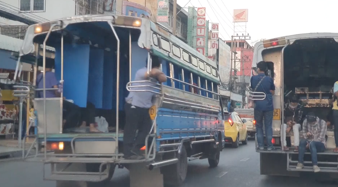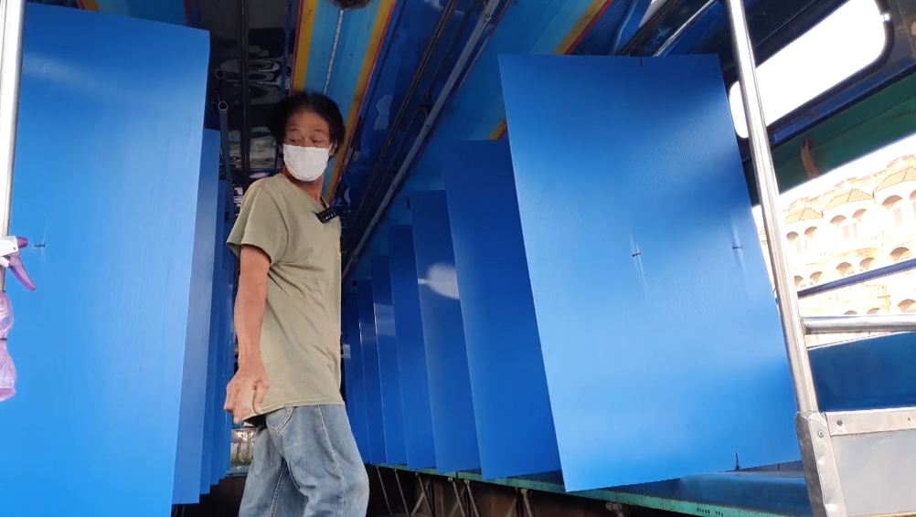 นายทองปลิว ปานศรี อายุ 60 ปีโชว์เฟอร์รถสองแถวใหญ่รับจ้างบรรทุกคนงานจากย่านวัดศรีสุทธาราม(วัดกำพร้า) อำเภอเมืองสมุทรสาคร เปิดเผยว่ายุคนี้โควิด-19ระบาดในพื้นที่สมุทรสาครอย่างหนักทำให้ทางบริษัทที่ว่าจ้างตนและเพื่อนๆ อีกหลายคันขับรถเพื่อรับ-ส่งคนงานในช่วงเช้าและเย็น ทำการแบ่งที่นั่งของผู้โดยสารให้มีที่กั้นเพื่อป้องกันการแพร่เชื้อโควิด-19 ในรถ โดยการใช้แผ่นฟิวเจอร์บอร์ดมากั้นเป็นล็อกๆ แต่ละคนนั่งได้ 1 ล็อก คันหนึ่งบรรทุกได้ 18-20 คน