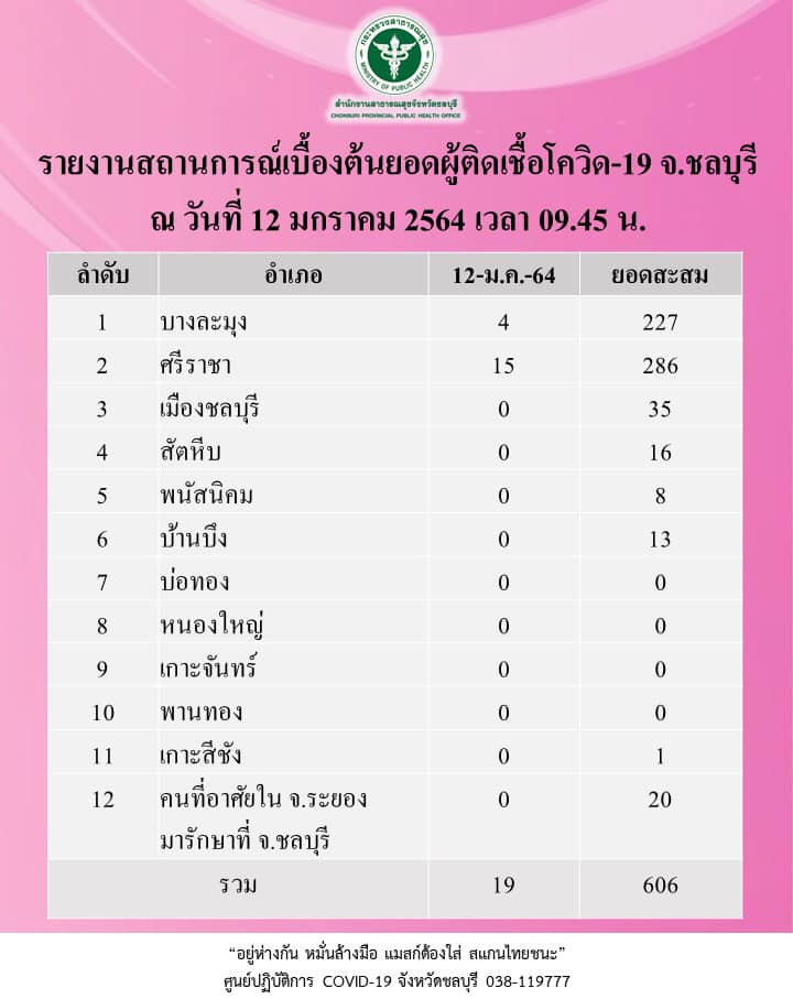 ชลบุรี 12 ม.ค.-พุ่งไม่หยุด! ชลบุรีพบติดเชื้อโควิดเพิ่มอีก 19 ราย เกี่ยวข้องกับโรงเบียร์ 90 ศรีราชา 9 ราย ส่งผลยอดผู้ป่วยสะสมทะลุ 600 รายแล้ว