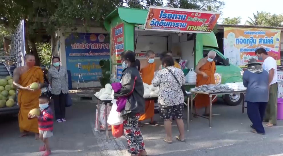 สมุทรสงคราม 14 ม.ค.- หลวงพ่อแดง นันทิโย รองเจ้าคณะอำเภออัมพวา เจ้าอาวาสวัดอินทาราม จัดทำโรงทานเดลิเวอรี่ เป็นครัวเคลื่อนที่บนรถเอนกประสงค์ ตระเวนไปตามสถานที่ต่างๆ เพื่อเลี้ยงอาหารให้กับนักเรียนนักศึกษาผู้ยากไร้
