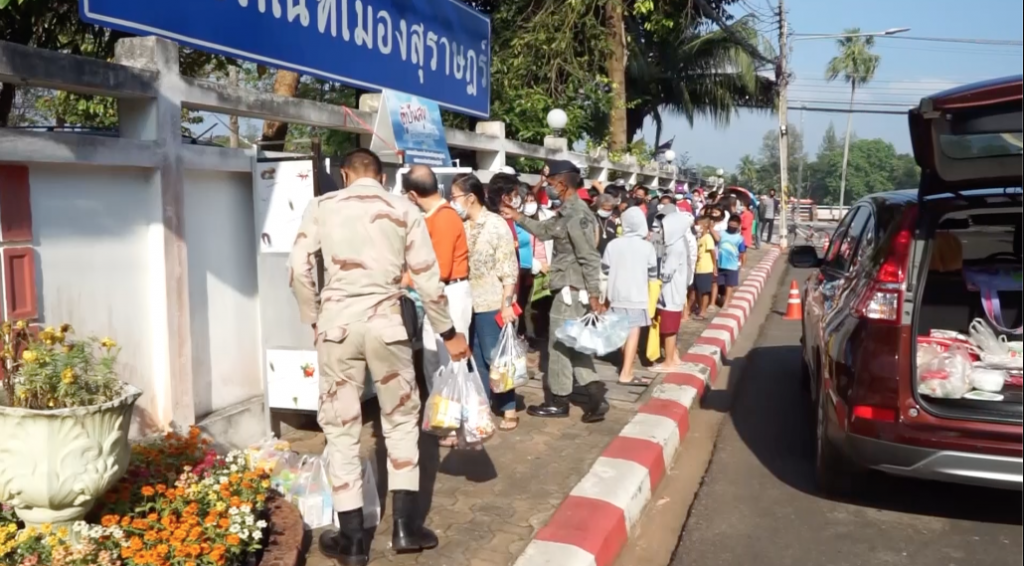 นี่เป็นภาพประชาชนจำนวนมากมาต่อแถว เพื่อรับของจากตู้ปันสุข ที่วางอยู่ที่บริเวณริมกำแพงหน้าบ้านพักผู้ว่าราชการจังหวัดสุราษฎร์ธานี ส่วนใหญ่เป็นผู้เดือดร้อนจากโควิด-19 ของที่อยู่ในตู้ปันสุข ส่วนหนึ่งเป็นของจากที่พระสงฆ์วัดไตรธรรมาราม เขตเทศบาลนครสุราษฎร์ธานีรับบิณฑบาตมาแล้วมาใส่ในตู้ปันสุขมีทั้งอาหารปรุงสุกใหม่ ขนม ชาวบ้านผู้เดือดร้อนทั้งเด็กและผู้ใหญ่ได้มาเข้าคิวรอรับของ บางคนเลือกเฉพาะสิ่งของที่จำเป็นคนละชิ้น 2 ชิ้น แต่บางคนเอาใส่ถุงที่เตรียมมาจำนวนมาก แม้ว่า อส.ที่ดูแลอยู่จะขอร้องให้แบ่งปันคนอื่นบ้างเพราะคนเดือดร้อนเยอะ ภายในเวลาไม่ถึง 10 นาทีของในตู้ปันสุขแทบหมดเกลี้ยง.-สำนักข่าวไทย