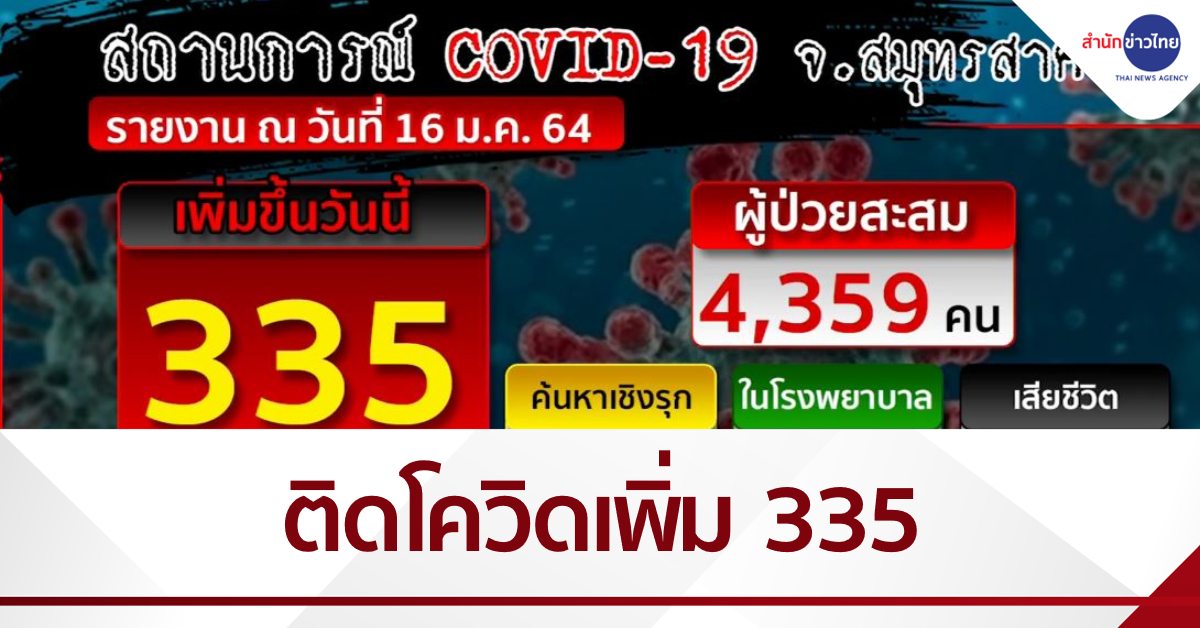 สมุทรสาคร 16 ม.ค. – สถานการณ์แพร่ระบาดของโควิด-19 ใน จ.สมุทรสาคร วันนี้ติดเชื้อเพิ่มอีก 335 ราย โดยพบจากการตรวจค้นหาเชิงรุกรวม 311 ราย และพบจากการตรวจหาเชื้อในโรงพยาบาลอีก 24 ราย