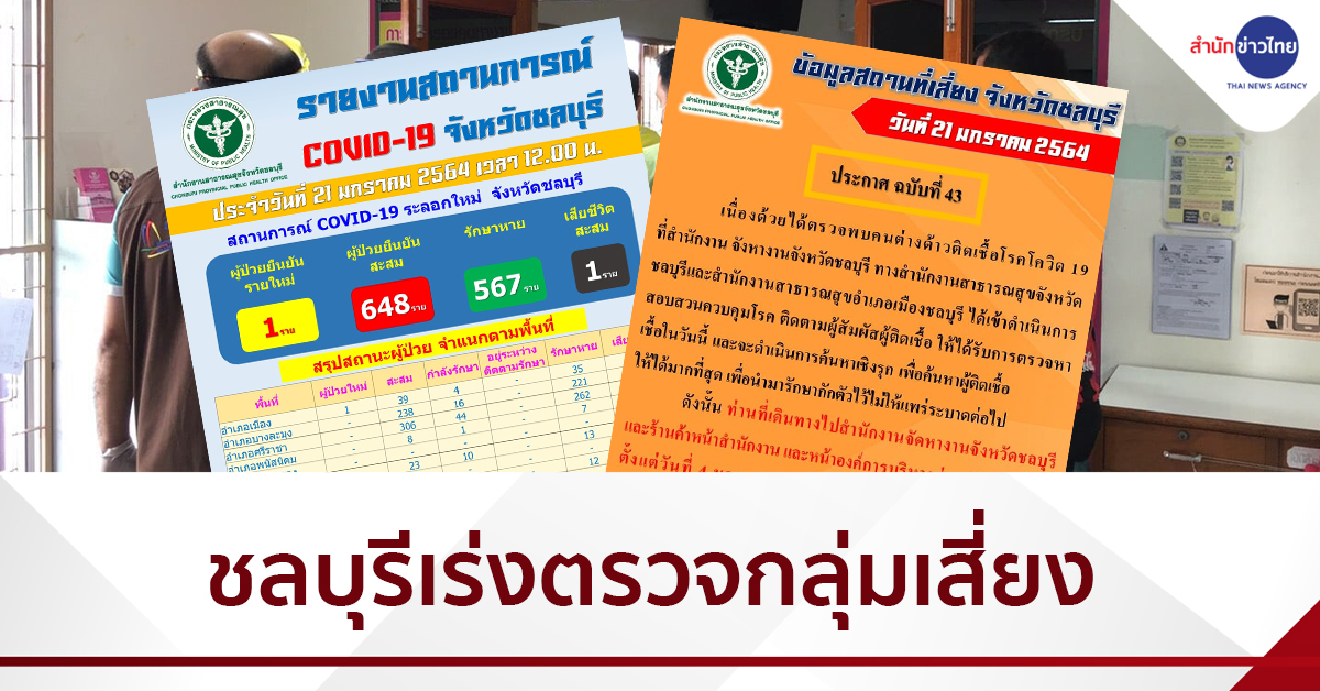 ชลบุรี 21 ม.ค.-ส่อวุ่นอีก! ชลบุรีพบติดเชื้อโควิดรายใหม่ 1 ราย สาธารณสุขเร่งติดตามผู้เสี่ยงสัมผัส 75 คน มาตรวจหาเชื้อ เพื่อควบคุมการแพร่ระบาด พร้อมกับปิดสำนักงานฯ ที่เป็นแหล่งติดเชื้อชั่วคราว จนกว่าจะสอบสวนควบคุมโรคแล้วเสร็จ