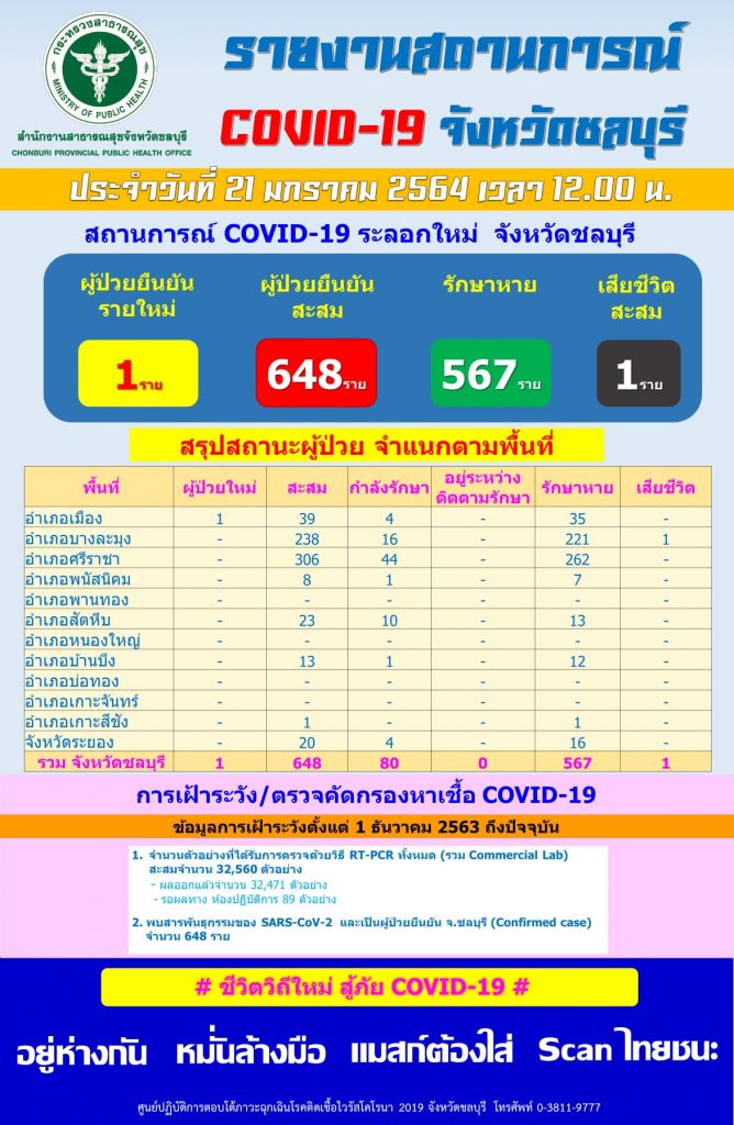 การพบผู้ติดเชื้อโควิดรายใหม่อีก 1 รายในวันนี้ ทำให้จังหวัดชลบุรีมียอดผู้ป่วยโควิดสะสม รวม 648 ราย รักษาหายแล้ว 567 ราย กำลังรักษา 80 ราย และเสียชีวิต 1 ราย.-สำนักข่าวไทย