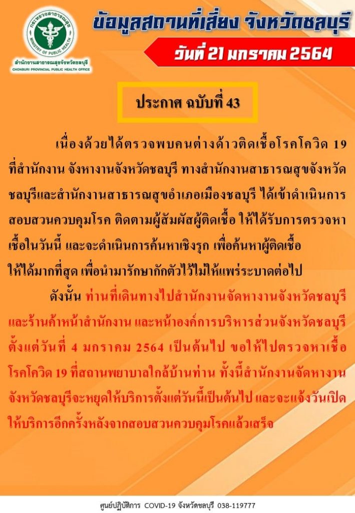 ดังนั้น ขอให้ผู้ที่เดินทางไปสำนักงานจัดหางานจังหวัดชลบุรี และร้านค้าหน้าสำนักงาน และหน้าองค์การบริหารส่วนจังหวัดชลบุรี ตั้งแต่วันที่ 4 ม.ค.64 ที่ผ่านมา ไปตรวจหาเชื้อโควิดที่สถานพยาบาลใกล้บ้านท่าน ในส่วนของสำนักงานจัดหางานจังหวัดชลบุรีจะหยุดให้บริการตั้งแต่วันนี้เป็นต้นไป และจะแจ้งวันเปิดให้บริการอีกครั้งหลังจากสอบสวนควบคุมโรคแล้วเสร็จ