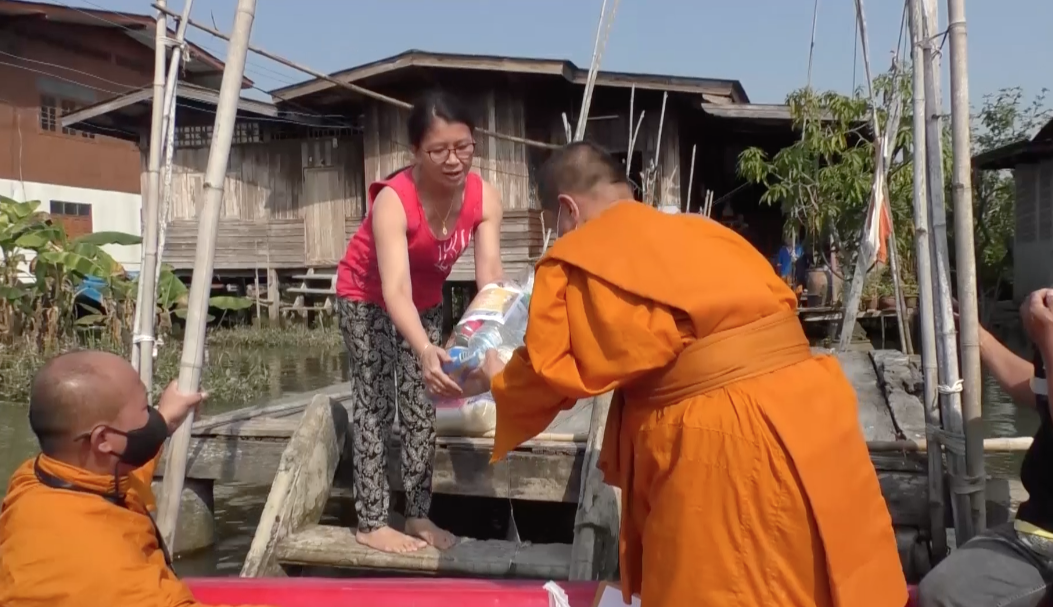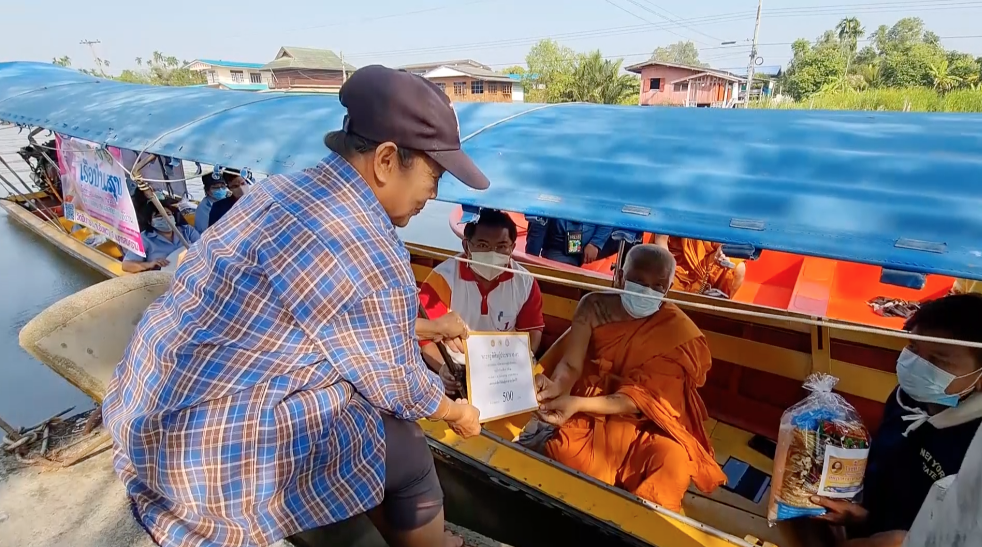 สมุทรสงคราม 21 ม.ค.- โรงทานเดลิเวอรีวัดอินทาราม จ.สมุทรสงคราม ออกแจกข้าวกล่องพร้อมข้าวสารอาหารแห้งให้กับประชาชนที่เดือดร้อน ลงเรือล่องไปในคลองแควอ้อม ระยะทาง 10 กิโลเมตร