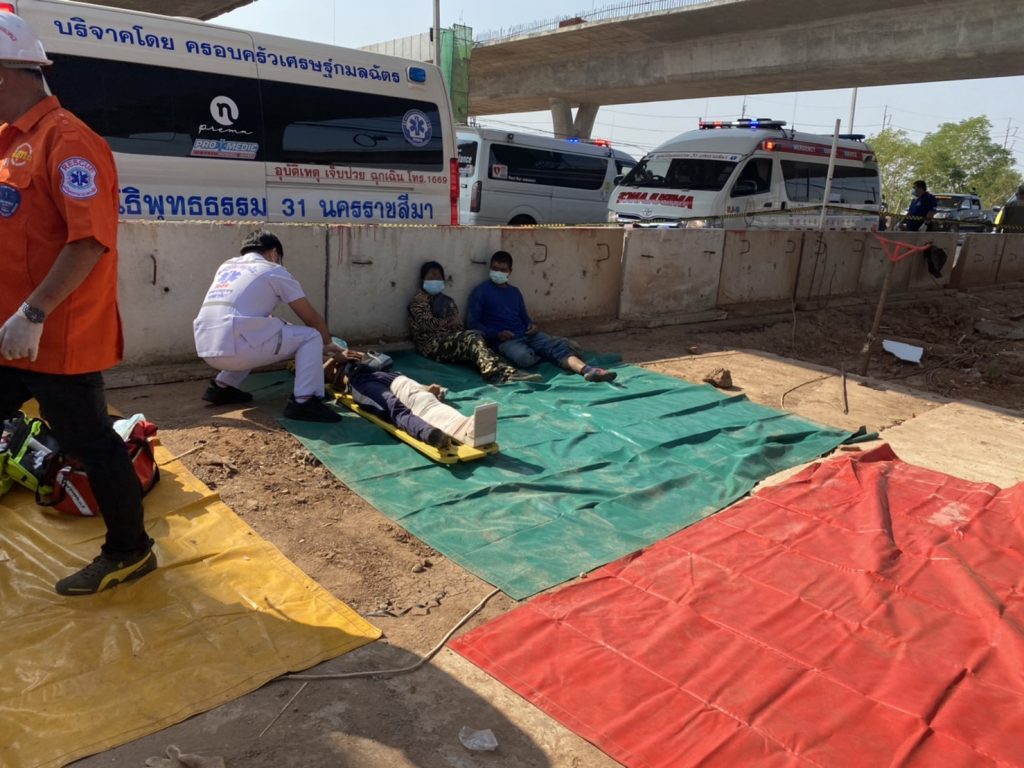 นครราชสีมา 23 ม.ค.-ถนนวงแหวนรอบเมืองนครราชสีมา ที่อยู่ระหว่างก่อสร้าง พังถล่ม เหตุนั่งร้านรับน้ำหนักคอนกรีตที่กำลังเทไม่ไหว คนงานบาดเจ็บนับสิบ