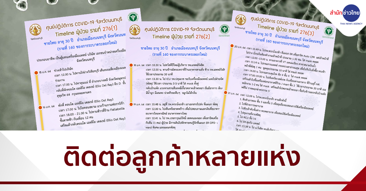 24 ม.ค.-ศูนย์ปฏิบัติการ COVID-19 จังหวัดนนทบุรี เปิดไทม์ไลน์ ผู้ป่วยรายที่ 276 อาชีพผู้แทนเครื่องมือแพทย์บริษัทเอกชน พบเดินทางติดต่อลูกค้าหลายพื้นที่แม้มีอาการป่วย