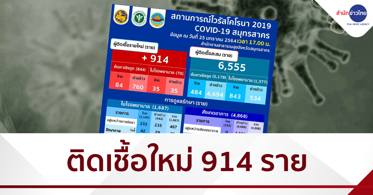 สมุทรสาคร 25 ม.ค.-สถานการณ์การติดเชื้อโควิด-19 สมุทรสาคร พบผู้ติดเชื้อรายใหม่ 914 ราย ในจำนวนนี้เป็นการค้นหาเชิงรุก 844 ราย ขณะที่ยอดป่วยยืนยันสะสม 6,555 ราย