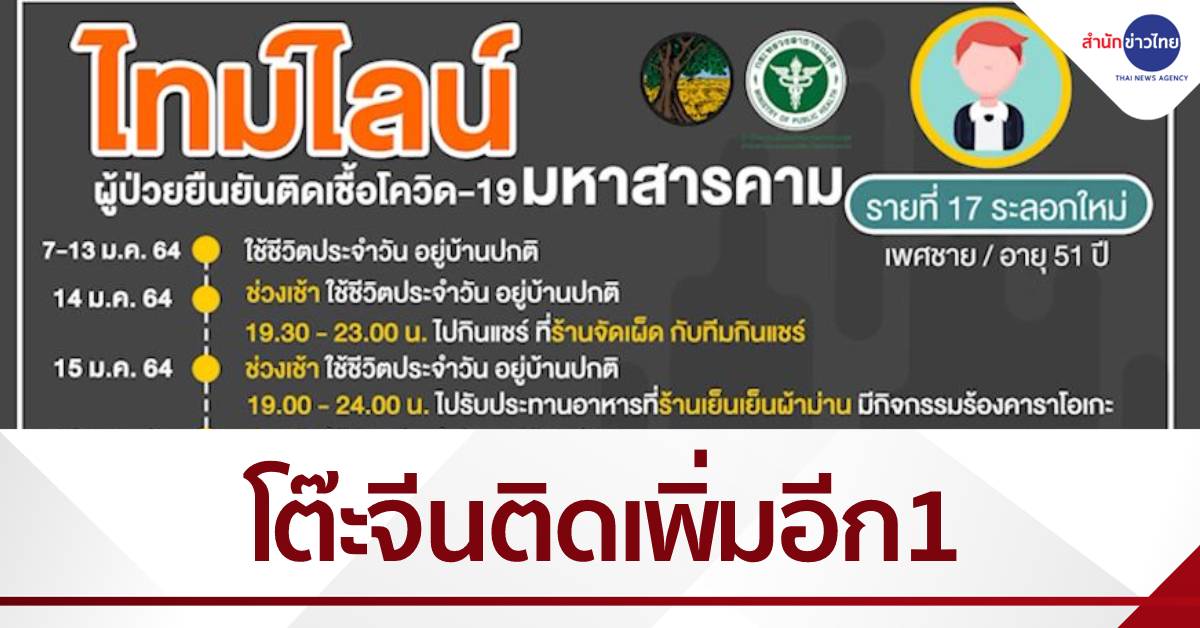 สาธารณสุขมหาสารคาม ระบุพบชายอายุ 51 ปี ติดโควิดจากกลุ่มก้อนที่ไปงานเลี้ยงโต๊ะแชร์ เพิ่มอีก 1 คน โดยอยู่ในกลุ่มเสี่ยงสูง เพราะเป็นสามีหญิงติดเชื้อรายที่ 16 ส่วนการสอบสวนโรค พบว่าผู้ติดเชื้อได้ไปงานเลี้ยงโต๊ะแชร์เมื่อวันที่ 14 มกราคม และนั่งเยื้องกับผู้ติดเชื้อรายที่ 2 ที่คาดเป็นคนมาแพร่เชื้อ จากนั้นวันที่ 15 ไปร้องคาราโอเกะที่บ้านรายที่ 4 ก่อนไปกรุงเทพฯ และกลับมหาสารคามวันที่ 18 โดยเริ่มจมูกไม่ได้กลิ่น ลิ้นไม่รับรส และวันที่ 23 ออกไปกินเลี้ยงโต๊ะแชร์อีก ก่อนเริ่มปวดเมื่อยเนื้อเมื่อยตัว