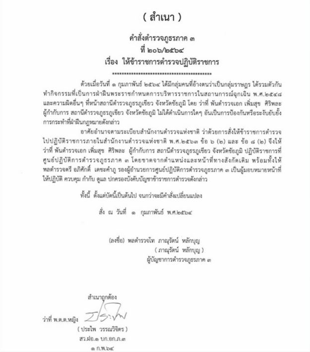 กรณีเมื่อช่วงเย็นวานนี้ (1 ก.พ.) มีกลุ่มคนอ้างเป็นกลุ่มราษฎรรวมตัวทำกิจกรรม นำป้ายข้อความที่เกี่ยวข้องกับการปฏิรูปสถาบัน แขวนทับป้ายชื่อสถานีตำรวจภูธรภูเขียว จ.ชัยภูมิ โดยกางเต็นท์และตั้งเวทีที่บริเวณหน้าบันไดทางเข้า ซึ่งฝ่าฝืน พ.ร.ก.ฉุกเฉิน และความผิดอื่นๆ ล่าสุด พล.ต.ท.ภาณุรัตน์ หลักบุญ ผู้บัญชาการตำรวจภูธรภาค 3 มีคำสั่งให้ว่าที่ พ.ต.อ.เพิ่มสุข ศิริพละ ผู้กำกับการ สภ.ภูเขียว มาปฏิบัติราชการที่ศูนย์ปฏิบัติการตำรวจภูธรภาค 3 โดยให้ขาดจากตำแหน่งและหน้าที่สังกัดเดิม และมีคำสั่งมอบหมายให้ พ.ต.อ.ปราโมทย์ สิมหลวง รองผู้บังคับการตำรวจภูธรจังหวัดชัยภูมิ รักษาราชการแทน ขณะที่ พล.ต.ท.ภาณุรัตน์ ผู้บัญชาการตำรวจภูธรภาค 3 ได้โกนผม เพื่อธำรงวินัยและแสดงความรับผิดชอบในสิ่งที่เกิดขึ้น.-สำนักข่าวไทย