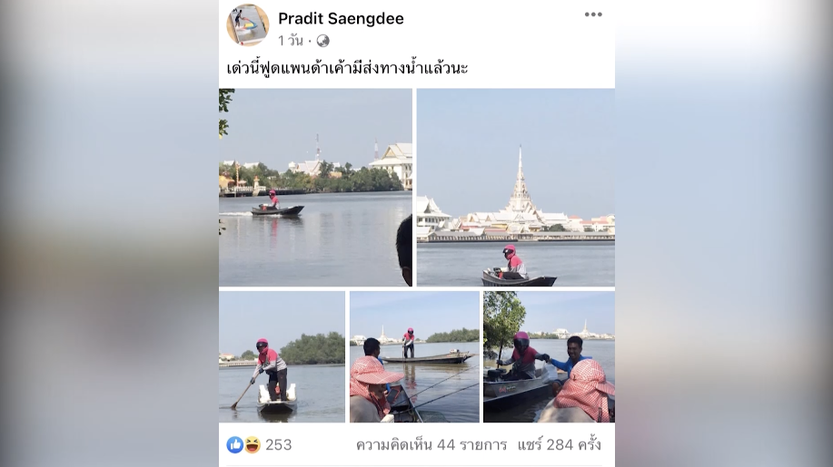 เป็นโพสต์ที่ถูกแชร์ไปทั่วโลกออนไลน์ หลังจากที่ผู้ใช้เฟซบุ๊ก @Pradit Saengdee โพสต์ภาพขณะพนักงานดิลิเวอรี “ฟู้ดแพนด้า” ขับเรือพร้อมสวมหมวกกันน็อก แต่งตัวเต็มเครื่องแบบ นำอาหารอาหารส่งให้กับลูกค้าในเรือริมแม่น้ำบางปะกง ต.หน้าเมือง อ.เมือง ฉะเชิงเทรา เหตุการณ์ดังกล่าวเกิดขึ้นเมื่อวันที่ 2 ก.พ.ที่ผ่านมาพร้อมระบุข้อความว่า “เดี๋ยวนี้ ฟู้ดแพนด้า เขามีส่งทางน้ำแล้วนะ” หลังจากที่โพสต์ดังกล่าวถูกเเชร์ไปในโลกออนไลน์ ชาวเน็ตต่างเข้ามาชื่นชมในความพยายามบริการลูกค้าของพนักงานคนดังกล่าว พร้อมเป็นห่วงในความปลอดภัย