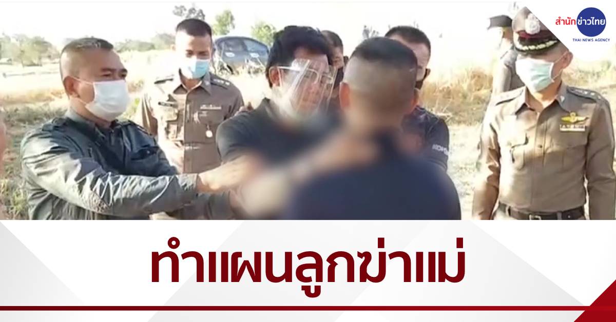 ชัยภูมิ 4 ก.พ.-ตำรวจชัยภูมิคุมตัวลูกทรพี บีบคอแม่จนแน่นิ่ง แล้วกระทืบซ้ำจนเลือดทะลักเสียชีวิต มาทำแผน ท่ามกลางเสียงสาปแช่งเรียกร้องให้ประหาร เหตุจากขอแบ่งที่นาและขอเงินแม่ 200 บาท ไปซื้อยาบ้ามาเสพ แต่แม่ไม่ให้ จึงแค้นวางแผนฆ่า