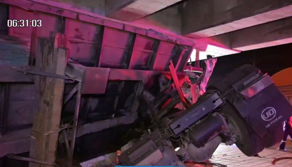 ร.ต.ท.อนุพงษ์ หงส์ไทย รอง.สว (สอบสวน) สถานีตำรวจภูธรเมืองฉะเชิงเทรา เข้าตรวจสอบอุบัติเหตุ รถบรรทุกเทรลเลอร์ 18 ล้อ ยี่ห้อ นิสสัน UD GWE 370 ของบริษัท พนาวัน ขนส่ง จำกัด หมายเลขทะเบียนหัวพ่วง 70-2335 บุรีรัมย์ ท้ายพ่วง ทะเบียน 70-1160 บุรีรัมย์ เสียพลิกคว่ำชนเข้ากับตอม่อสะพานข้ามแยกวัดสมานรัตนราม ถ.304 ฉะเชิงเทรา-พนมสารคาม มุ่งหน้าเข้าตัวเมืองฉะเชิงเทรา พื้นที่ ม.8 ต.บางไผ่ อ.เมือง จ.ฉะเชิงเทรา สภาพด้านหน้ารถพังเสียหายหลังคาหลุดออกจากรถ ส่วนหัวเก๋งชนอัดติดกับตอม่อ จนล้อของรถลอยเหนือพื้น ส่วนตู้คอนเทนเนอร์ที่บรรทุกยางแผ่นอัดก้อน จำนวน 20 ตัน หลุดออกจากรถ พลิกคว่ำขวางถนน 1 ช่องจราจร เบื้องต้นตรวจสอบเอกสารรับส่งของภายในรถ พบว่ารถบรรทุกคันดังกล่าวนำยางแผ่นอัดก้อนมาจากบุรีรัมย์ กำลังนำไปส่งที่โกดัง ท่าเรือแหลมฉบัง จังหวัดชลบุรี