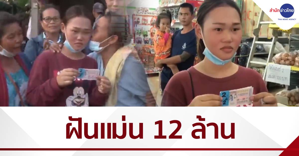 นครพนม 16 ก.พ.-แคชเชียร์สาวร้านค้าที่นครพนม ฝันว่ามีคนมาเขียนเลขให้ ขอเบิกเงินเจ้าของร้านซื้อลอตเตอรี่ 4 ใบ ถูกรางวัลที่ 1 สองใบ รับ 12 ล้าน