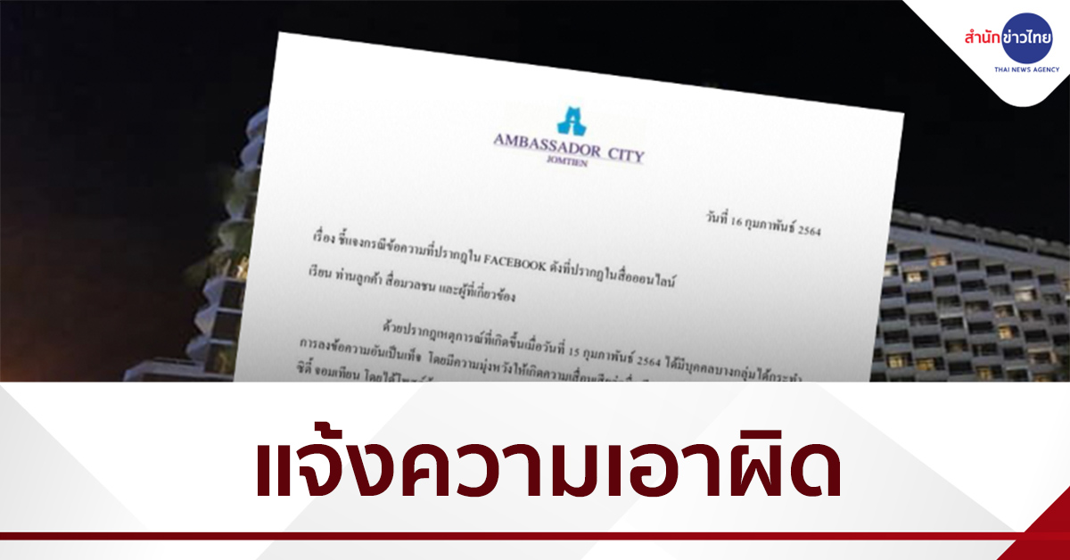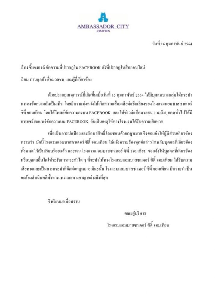 โรงแรมแอมบาสซาเดอร์ซิตี้ จอมเทียน ชี้แจงผ่านเฟซบุ๊ก Ambassador City Jomtien กรณีเมื่อวันที่ 15 กุมภาพันธ์ 2564 มีบุคคลบางกลุ่มได้กระทำการลงข้อความอันเป็นเท็จ โดยมุ่งหวังให้เกิดความเสื่อมเสียต่อชื่อเสียงของโรงแรมแอมบาสซาเดอร์ ซิตี้ จอมเทียน โดยได้โพสต์ข้อความลงบนเฟซบุ๊ก และให้ข่าวกับสื่อมวลชน รวมถึงบุคลลทั่วไปได้มีการแชร์เผยแพร่ข้อความบนเฟซบุ๊ก อันเป็นเหตุให้ทางโรงแรมได้รับความเสียหาย