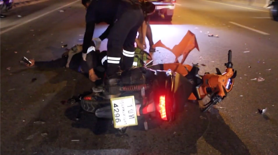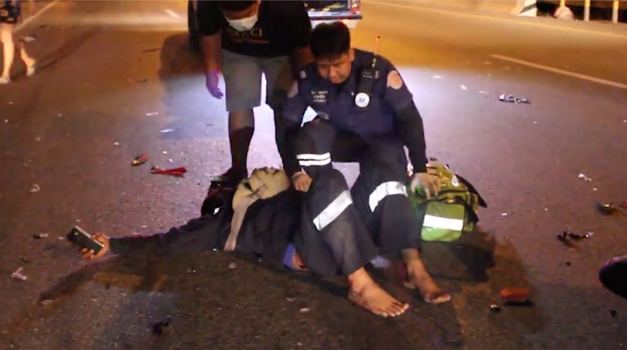 เจ้าหน้าที่กู้ภัยฉะเชิงเทรา จุดสุวินทวงศ์ กำลังช่วยกันปฐมพยาบาล นายสมพัก ใจชื่อ อายุ 39 ปี ผู้ขับขี่รถจักรยานยนต์ ฮอนด้าคลิก สีส้ม-ดำ หมายเลขทะเบียน 1 ขท 4296 กรุงเทพมหานคร สภาพรถด้านหน้าพังเสียหายยับเยิน โดยนายสมพัก ได้รับบาดเจ็บบริเวณขาขวาอยู่ในอาการมึนงง นอนอยู่บนถนนสุวินทวงศ์ ก่อนถึงปากทางเข้าวัดวีรโชติ ต.ศาลาแดง อ.บางน้ำเปรี้ยว จ.ฉะเชิงเทรา