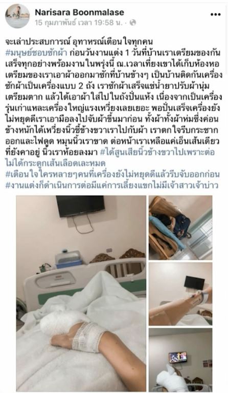 กรณีผู้ใช้เฟซบุ๊กชื่อ Narisara Boonmalase เล่าประสบการณ์เตือนผู้ใช้เครื่องซักผ้าให้ระวัง ระบุว่า ก่อนงานแต่งเพียง 1 วัน เธอได้นำผ้าห่มนวมไปซักที่บ้านญาติที่อยู่ติดกัน ซึ่งเป็นเครื่องซักผ้ารุ่นเก่าแบบ 2 ถัง ขณะนำใส่ถังปั่นแห้งที่มีแรงเหวี่ยงเยอะ พอปั่นเสร็จ เครื่องยังไม่หยุดหมุนสนิท จึงเอามือไปดึงผ้าห่มขึ้นมา แต่ผ้ามีน้ำหนักมาก บวกกับแรงเหวี่ยงของเครื่องซักผ้า ทำให้นิ้วไปพันผ้านวม แถมถูกไฟดูดด้วย จึงรีบกระชากออกมา ทำให้นิ้วขาดเหลือแต่เอ็น หมอบอกว่าไม่สามารถต่อได้